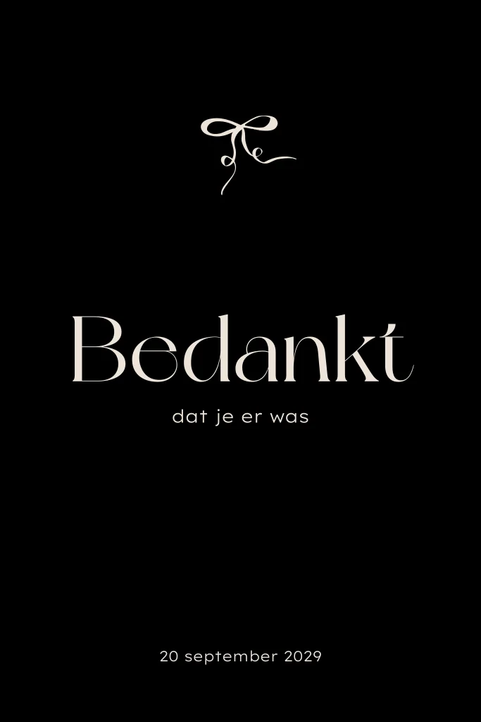 Bedank al jullie bruiloftsgasten met deze chique zwarte bedankkaart. Deze bedankkaart heeft een basic design met zwarte achtergrond en witte teksten en een sierlijk strikje. Teksten en kleuren zijn makkelijk aan te passen in onze editor. Hulp nodig met ontwerpen? Ons team staat voor je klaar!