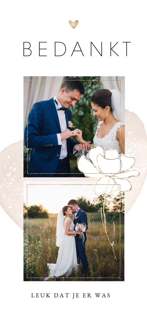 Wil je je gasten na het huwelijk bedanken voor een onvergetelijke dag? Dat kan met deze stijlvolle bedankkaart waarop je enkele foto's van jullie huwelijksdag kunt toevoegen. Deze bedankkaart met goudkleurige sierlijke bloem is onderdeel van onze trouwhuisstijl Classic Roses.