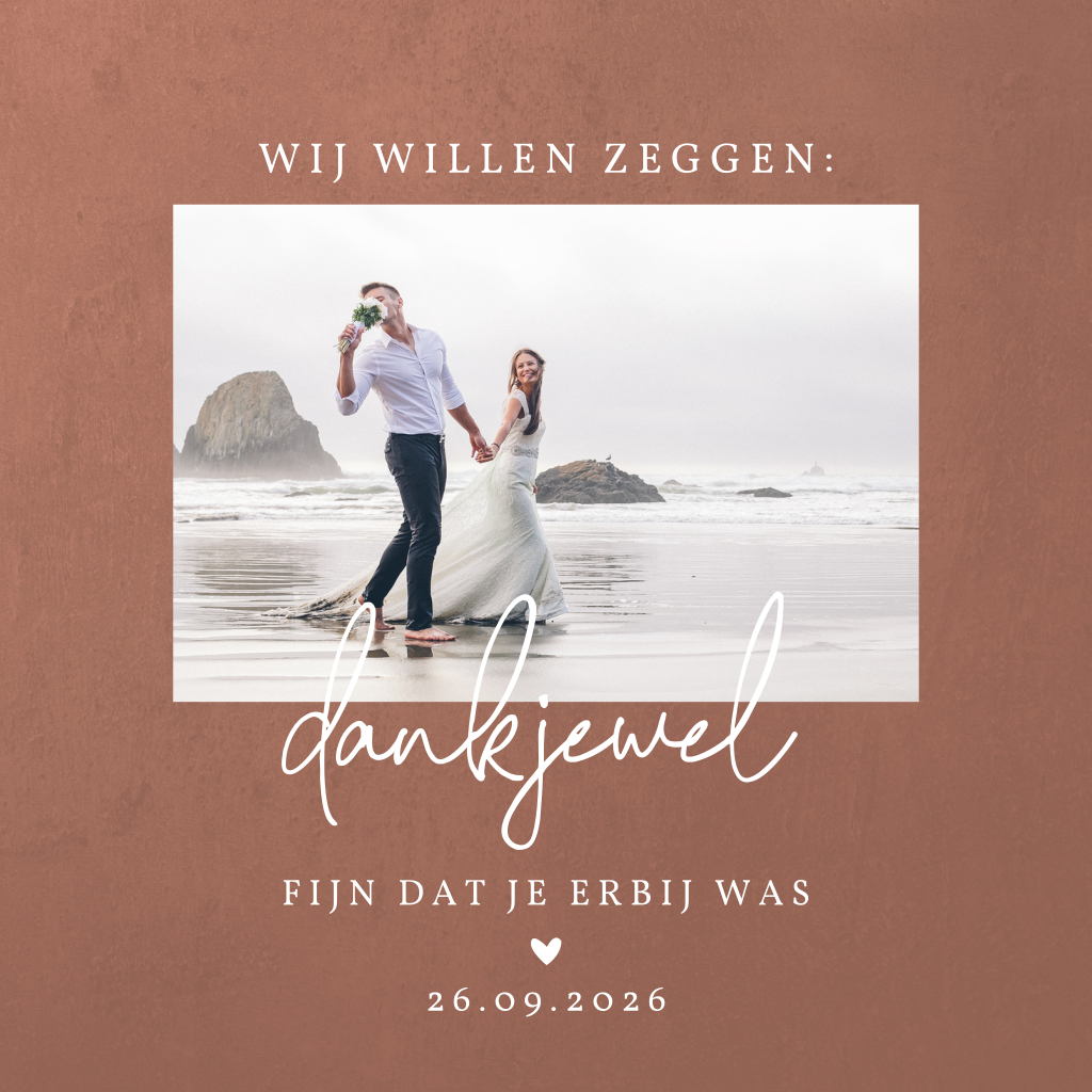 Jullie willen nog iets zeggen, en dat kan met dit kaartje: 'dankjewel'! Met dit schitterende bedankkaartje bedank je al je aanwezigen voor hun komst op jullie onvergetelijke trouwdag. Op deze kaart een eigen foto van jullie als stralend bruidspaar. De elementen in goudfolie voor de velvetlook achtergrond, maken van dit bedankkaartje echt een exclusief, luxe kaartje. Kleuren en teksten pas je eenvoudig aan in onze editor.