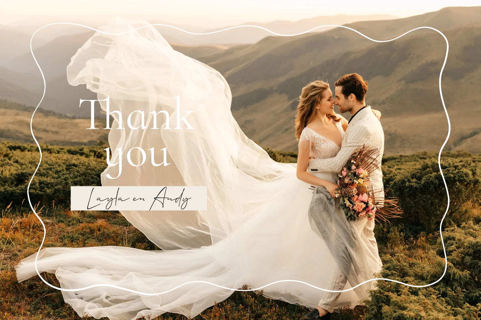 Bedankkaart met ruimte voor een eigen foto om al jullie gasten te bedanken voor de aanwezig op jullie trouwdag. Op de voorzijde staat een goudfolie golvende lijn en op de achterzijde zie je geometrische vlakken. Deze kaart is afgewerkt met luxe goudfolie. De kleur van de folie pas je heel makkelijk zelf aan in onze online editor. Deze bedankkaart hoort bij een trouwhuisstijl.