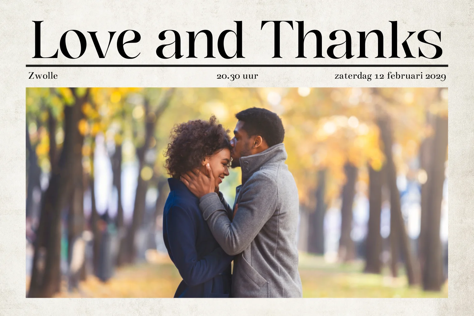 Grappige bedankkaart in een krant uitstraling. Zet een mooie foto van jullie als getrouwd stel op de voorkant. Je kunt de kaart naar je eigen wensen aanpassen in de editor. Hulp nodig bij het ontwerpen? Neem contact met ons op!
