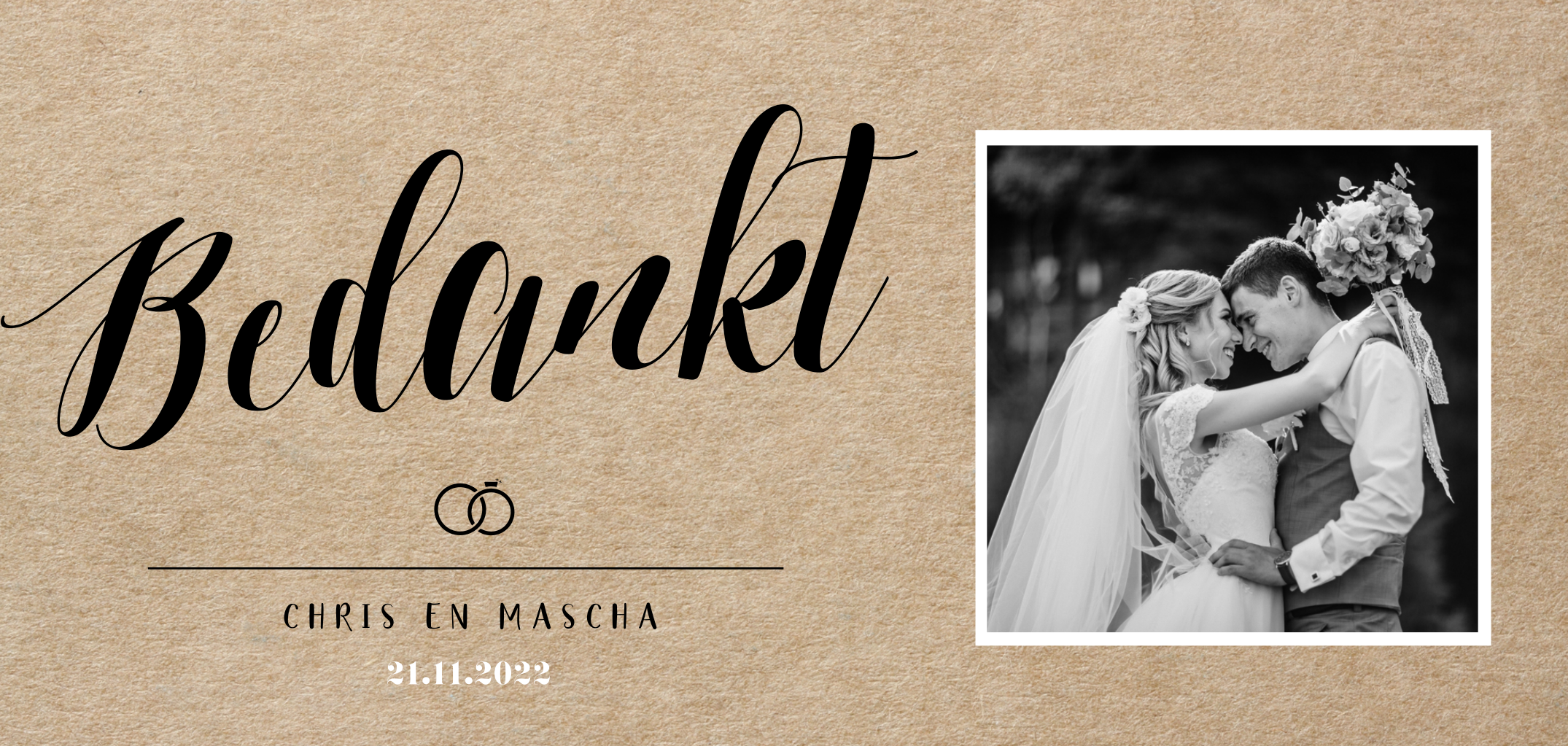 Met een bedankkaartje bedank je de gasten van jullie huwelijk voor hun aanwezigheid op jullie dag. Deze mooie bedankkaart met foto is onderdeel van onze trouwhuisstijl Lettering Karton.
