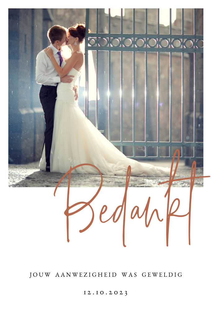 Met een bedankkaartje bedank je de gasten van jullie huwelijk voor hun aanwezigheid op jullie dag. Deze mooie bedankkaart met foto is onderdeel van onze trouwhuisstijl Lovely Lettering.