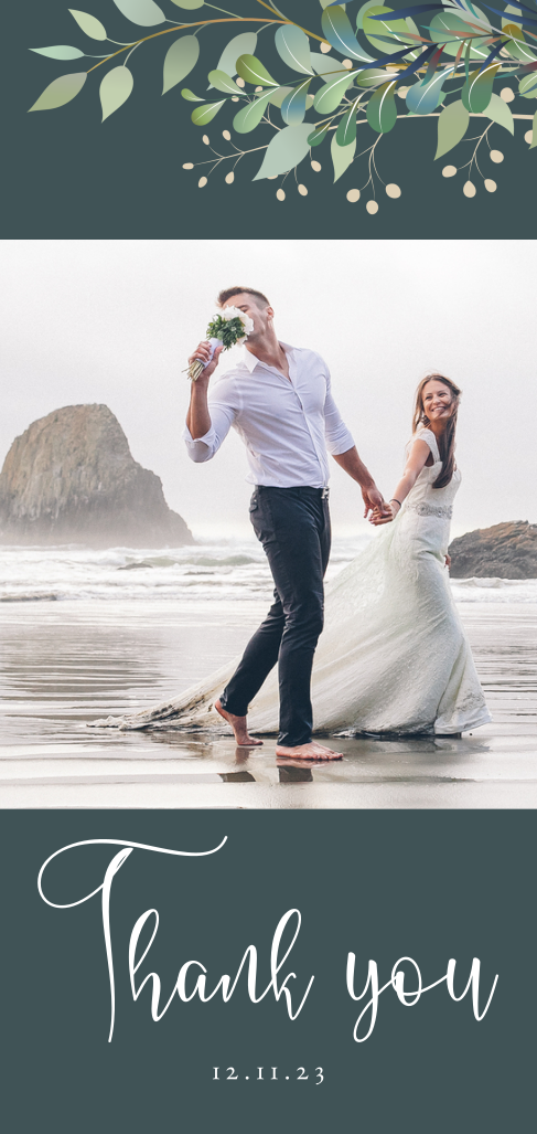 Hippe bedankkaart om de gasten van jullie bruiloft te bedanken voor een onvergetelijke dag. Deze bedankkaart in mooie groentinten is onderdeel van onze trouwhuisstijl Loving Leaves. Op deze kaart staat een mooie trouwfoto en stijlvolle botanische takjes.