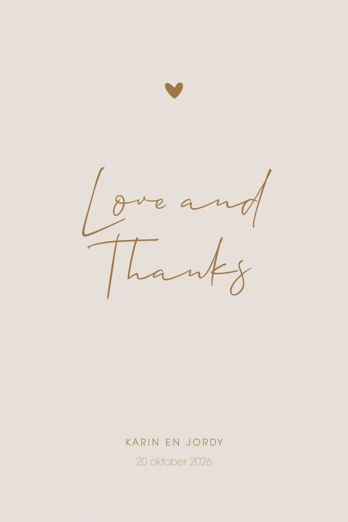 "Love and Thanks." Bedank al jullie bruiloftsgasten met deze eenvoudige trendy bedankkaart met een hartje en afgeronde hoeken. Deze kaart heeft een basic design, toch maakt het hartje deze kaart helemaal lief. Teksten en kleuren zijn makkelijk aan te passen in onze editor. Hulp nodig? We staan voor je klaar!