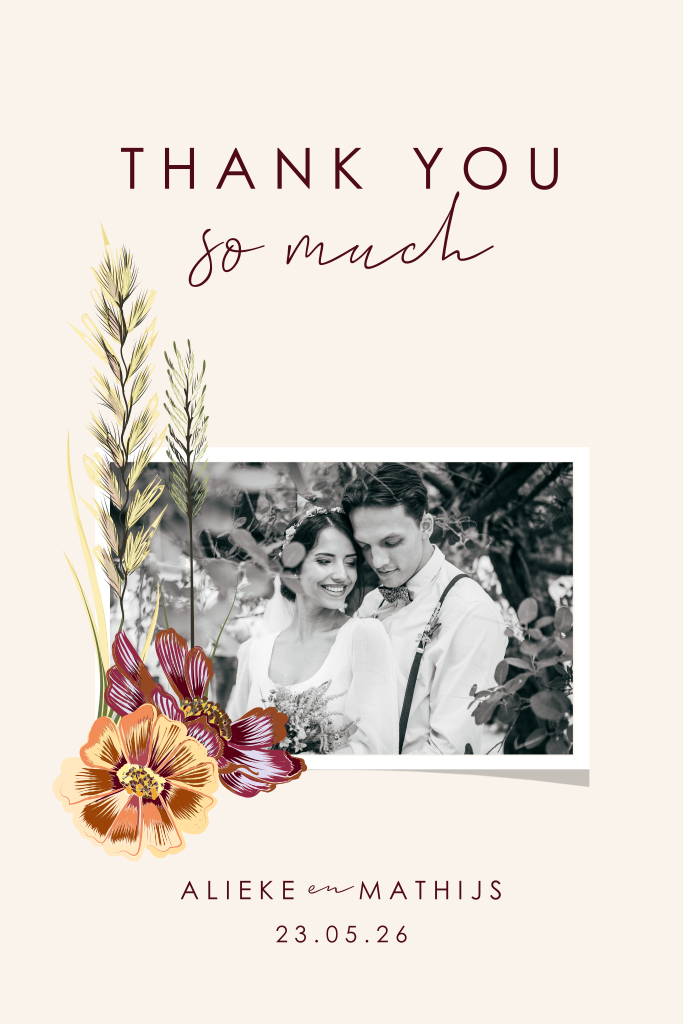 Bedank al jullie gasten met deze prachtige bedankkaart met afgeronde hoeken. Op deze bedankkaart de ruimte voor jullie eigen foto als stralend bruidspaar. De bloemen geven een fleurig tintje aan deze kaart. Pas de kaart naar eigen wensen aan in de editor. Hulp nodig? We staan voor je klaar!