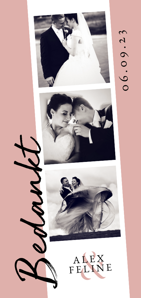 Met een bedankkaartje bedank je de gasten van jullie huwelijk voor hun aanwezigheid op jullie dag. Deze mooie bedankkaart met fotostrip is onderdeel van onze trouwhuisstijl Rustiek Roze.