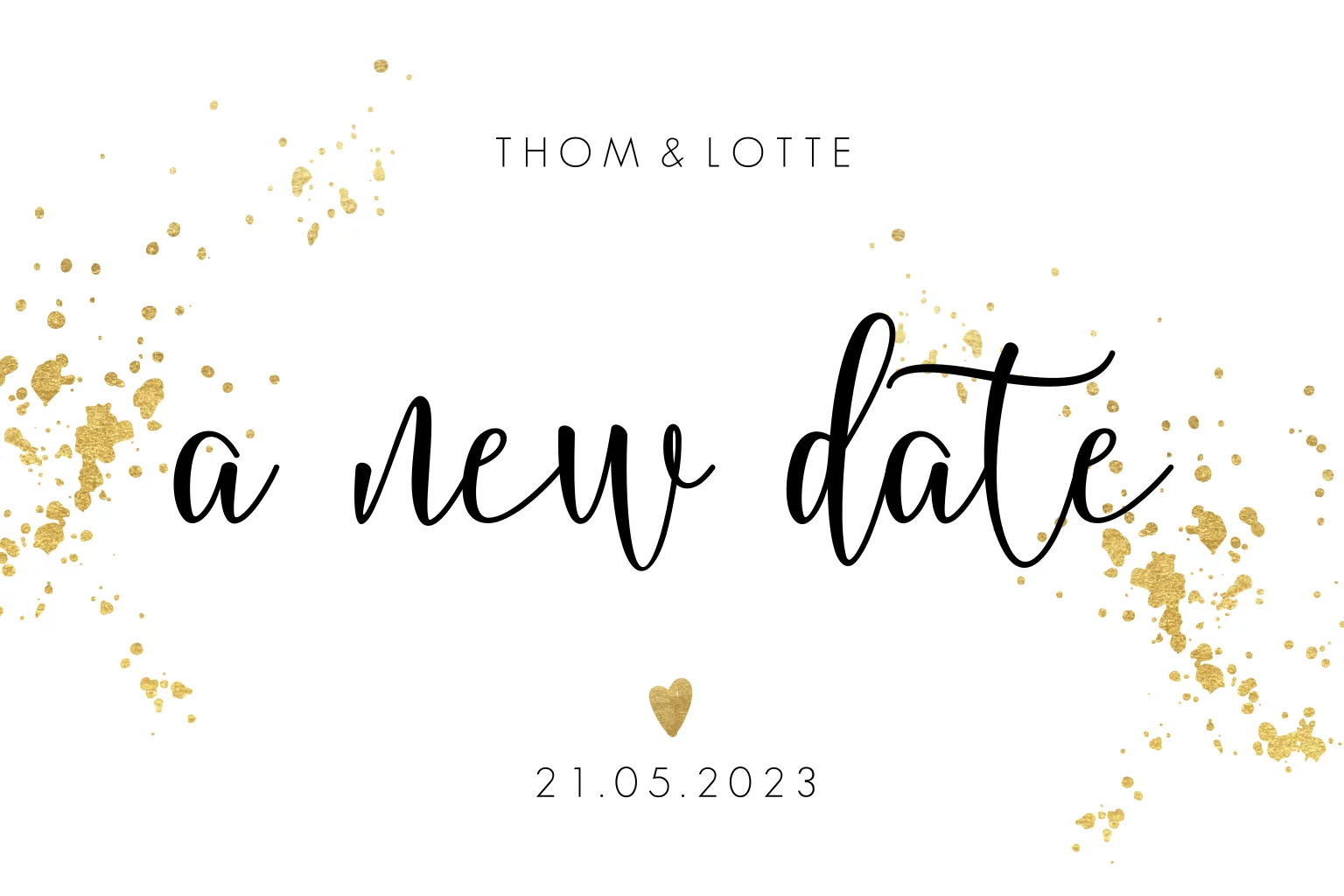 A new date voor jullie voorgenomen huwelijk? Wat ontzettend jammer dat jullie genoodzaakt zijn jullie bruiloft uit te stellen naar een andere datum. Informeer je gasten in stijl met dit speciale change the date kaartje met goudkleurige spetters en een sierlijk lettertype.