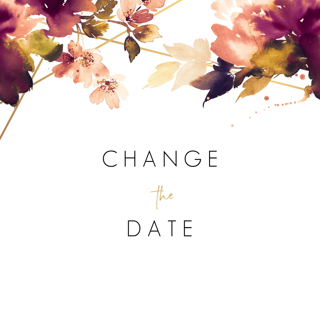 Gaan jullie de bruiloft uitstellen, maar zijn de uitnodigingen al de deur uit? Informeer je gasten in stijl met dit speciale change the date kaartje met mooie aquarel bloemen. Teksten en kleuren zijn aan te passen in de editor.