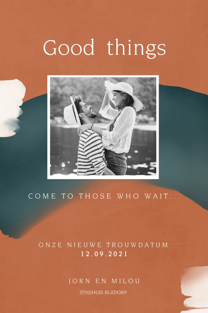 Een nieuwe trouwdatum voor jullie voorgenomen huwelijk? Wat ontzettend jammer dat jullie genoodzaakt zijn jullie bruiloft uit te stellen naar een later moment. Informeer je gasten in stijl met dit speciale change the date kaartje. Op deze kaart staat de tekst " Good things come to those who wait" en kun je een leuke foto toevoegen.