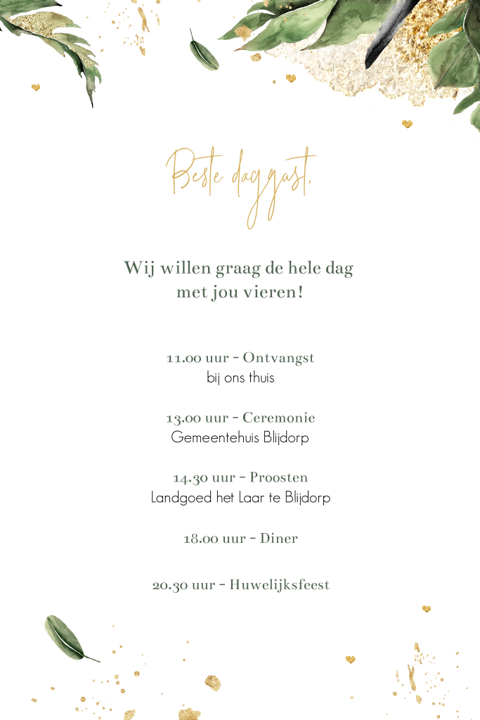 Je kunt je pocketfold zelf samenstellen. Dit informatiekaartje past perfect past bij de botanische trouwkaart uit onze pocketfold collectie. Op dit extra kaartje kun je het dagprogramma weergeven en eventuele andere belangrijke informatie over jullie huwelijksdag vermelden.