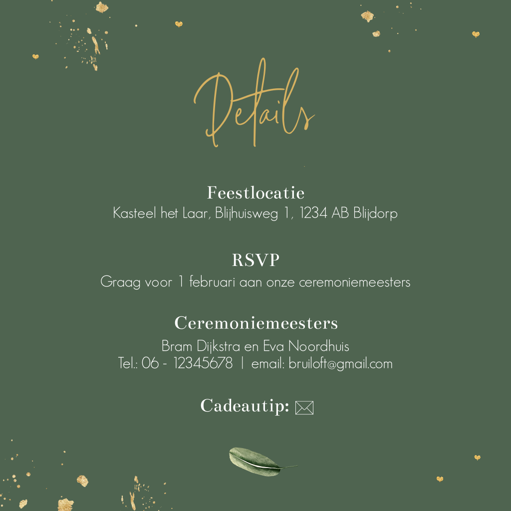 Dit informatiekaartje kun je toevoegen aan je pocketfold en past perfect bij onze pocketfold botanische trouwkaart. Dit extra kaartje is geschikt om details van jullie huwelijksdag op weer te geven, zoals het adres van de feestlocatie, RSVP of de gegevens van de ceremoniemeester.