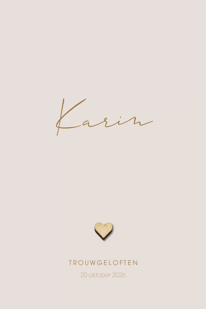Trendy trouw gelofte boekje met echt houten hartje. Dit geloftenboekje heeft een basic design maar het houten hartje maakt dit boekje helemaal exclusief. Voer de hele trouwhuisstijl eenvoudig door, door hier te klikken.