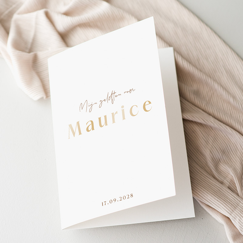 Een geloften boekje voor je bruiloft met een mooi clean design en hoogglans. Of je nu je geloften wilt uittypen of de binnenzijde blanco wilt laten om zelf met de hand te schrijven, dit geloften boekje is een prachtige toevoeging aan jullie ceremonie. Bovendien hoort dit geloftenboekje bij onze trouwkaarten set clean met hoogglans, waardoor het perfect aansluit bij jullie trouwuitnodigingen.| Totaalprijs: 0 |