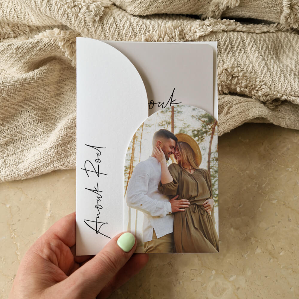 LET OP: Bestel de insteekkaart in het formaat 11 x 17 cm zodat deze mooi in het mapje past. Zowel het insteekmapje als de bijpassende insteekkaart kunnen worden gedrukt op linnen papier of op coated karton, zodat de kleuren zoveel mogelijk met elkaar overeenkomen. Foliedruk of hoogglans is alleen mogelijk op de voorzijde van het insteekmapje.