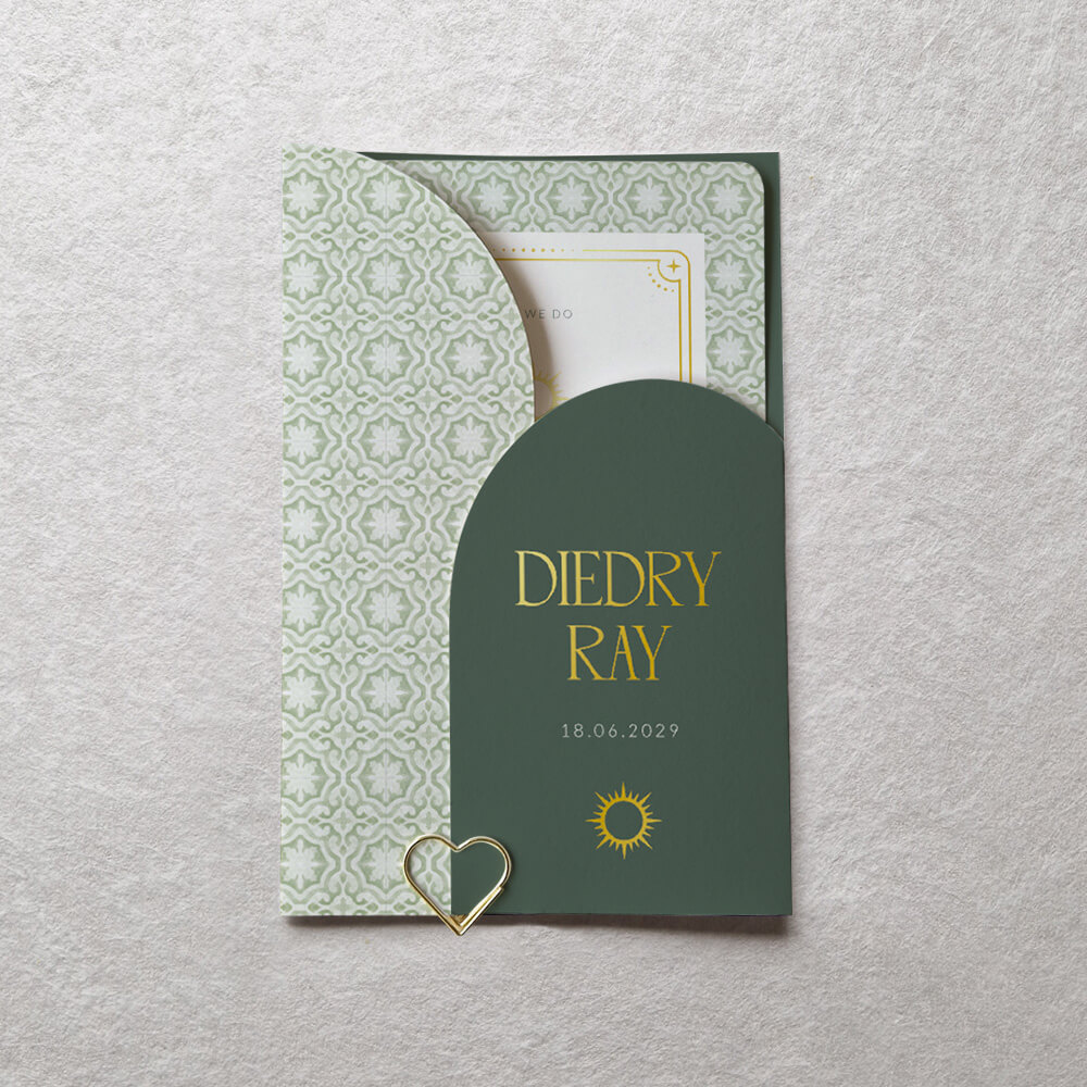 Op zoek naar een prachtige trouwuitnodiging? Kies dan voor een trouwkaart met insteekmapje. Deze nieuwe trend zal je gasten zeker verrassen! Dit mapje heeft een prachtig groen boho design met zon en goudfolie. Folie is alleen mogelijk op de voorzijde van het insteekmapje.