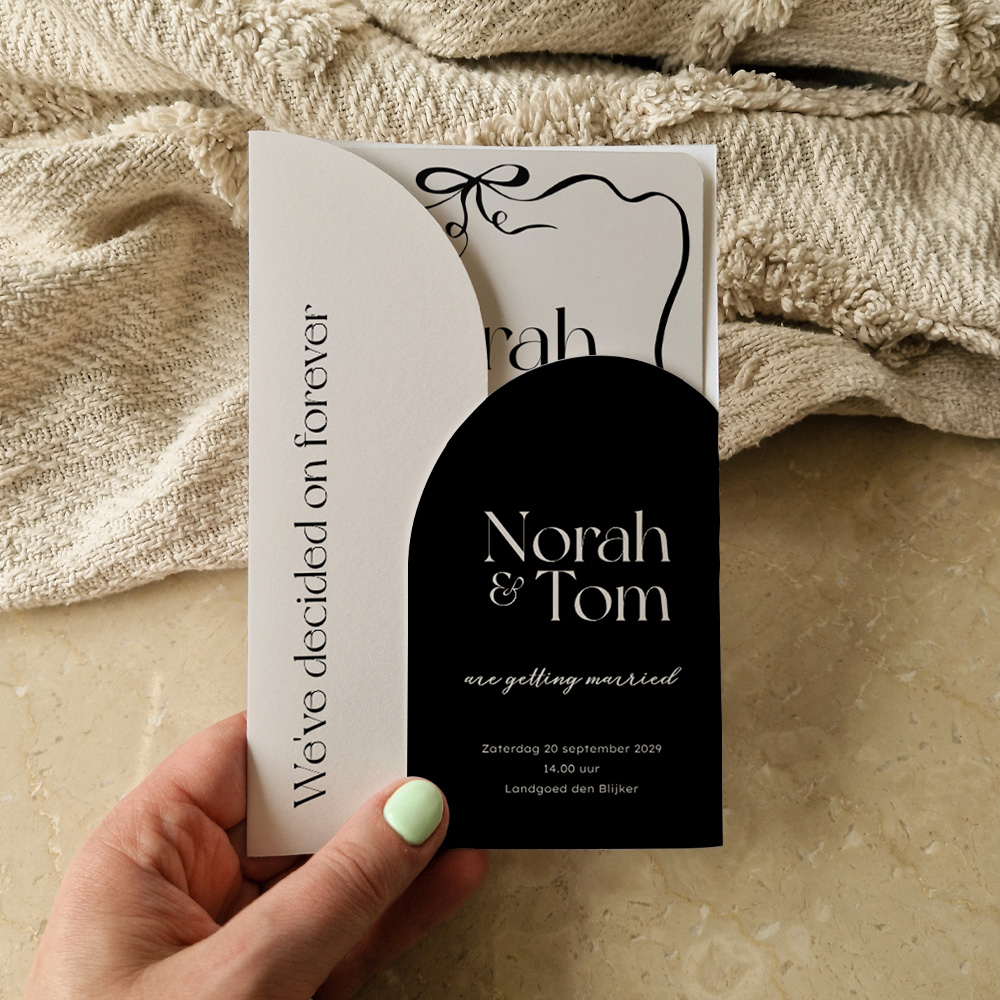 Stijlvol insteekmapje met trouwkaart. Een uniek en bijzondere manier om jullie bruiloft aan te kondigen. De insteekkaart en het insteekmapje zijn voorzien van zwarte met beige kleuren met een golvend kader en strik. Voeg aan de binnenzijde een stralende foto van jullie toe.