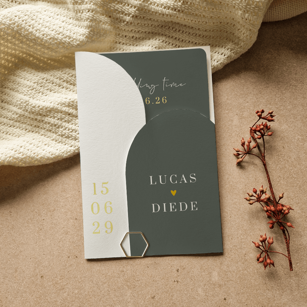 Rustig insteekmapje voor een trouwkaart met foliedruk en tijdlijn