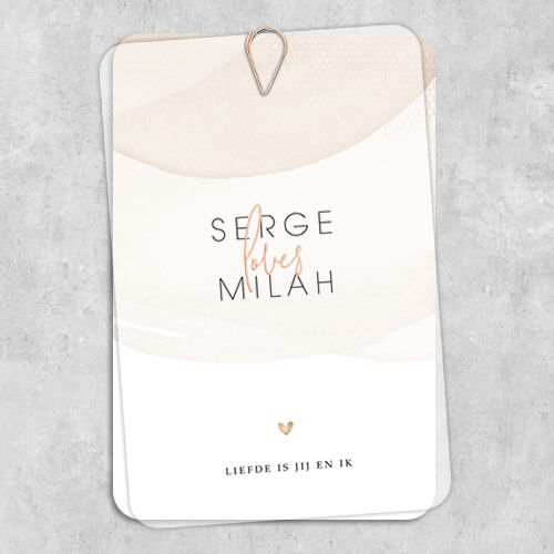 Trouwkaart met abstracte aquarel vegen en een honingraat patroon. De coverkaart is van kalkpapier. Hier staan de namen van het bruidspaar in een strak zwart lettertype. De tekst "loves" wordt gedrukt in een sierlijk lettertype in écht roséfolie. Je kunt dit naar je eigen smaak aanpassen naar goudfolie, zilverfolie, koperfolie of zwartfolie.