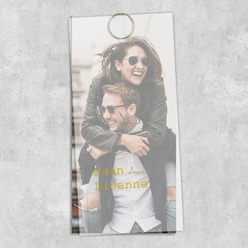 Trouwkaart met een mooie grote foto van jullie zelf. Op de achterzijde wordt de tekst "Yes we do" gedrukt in écht goudfolie. Op het kalkpapier velletje staan de namen van het bruidspaar welke worden gedrukt in écht goudfolie. Naast de voornamen staat een strakke lijn. De kleur van de folie kun je wijzigen in de editor. Prachtig als cover voor een mooie foto van jullie zelf.