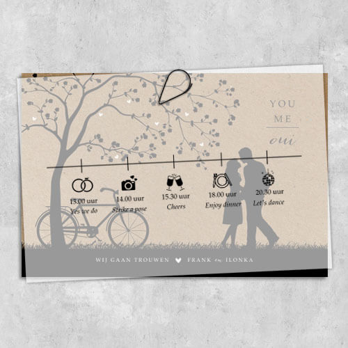 Kalkpapieren trouwkaart met een kraftlook achtergrond, een silhouet van een liefdeskoppel, fiets en boom. Op het velletje van kalkpapier staat een tijdlijn met iconen / symbolen om de dagindeling van jullie huwelijksdag weer te geven.