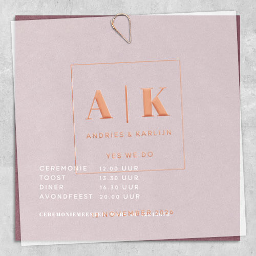 Prachtige kalkpapier trouwkaart met op de achtergrond een velvetlook, wat een zacht ogend effect geeft. De voorzijde is een kalkpapieren cover. Op dit velletje van kalkpapier staat een vierkant kader waarin de initialen en de namen van het bruidspaar gedrukt worden in écht roséfolie. De kleur van de folie kun je wijzigen in de editor.