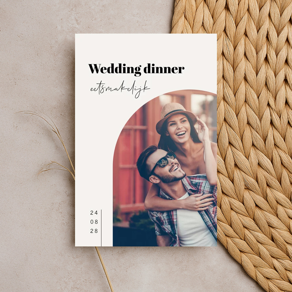 Eet smakelijk tijdens jullie Wedding dinner. Plaats op deze menukaart een eigen foto van jullie, als verliefd koppel. De foto staat in boogvorm, wat deze huwelijksuitnodiging net een tikje aparter maakt. Je kunt deze menukaart zelf bewerken in de editor en naar je eigen wensen aanpassen. Vragen? We helpen je graag!