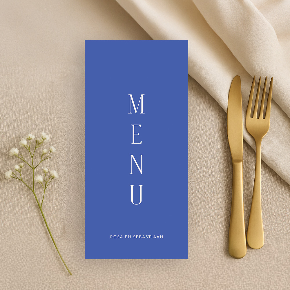 Voer de stijl van je trouwkaart door naar jullie bruiloftsdiner. Deze colorblocking menukaart heeft een basic design met een felle blauwe kleur met witte letters. Een menukaart die opvalt dus! Je kunt deze menukaart zelf bewerken in de editor en naar je eigen wensen aanpassen. Vragen? We helpen je graag!