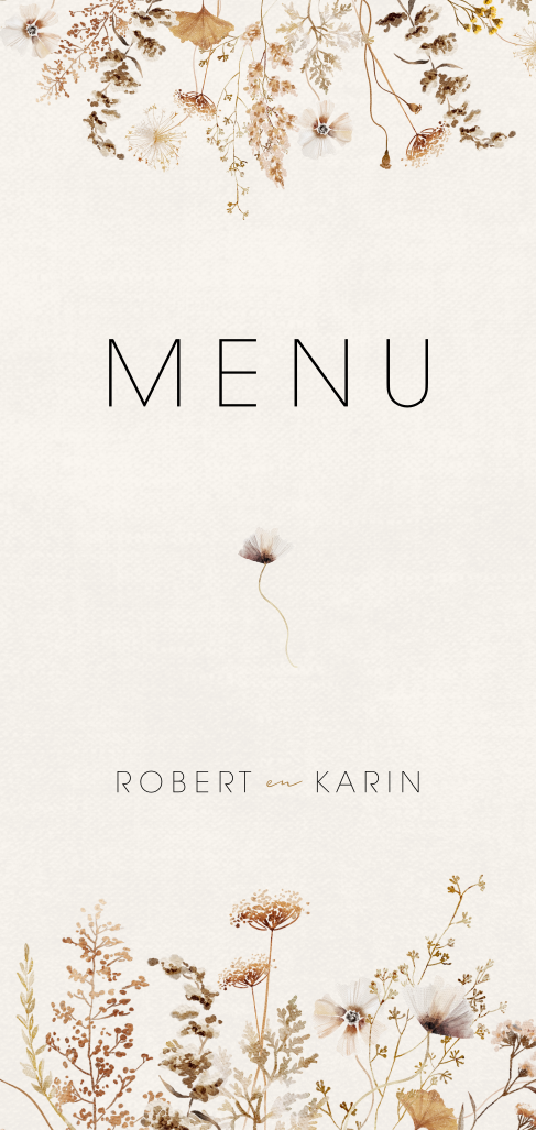 Fraaie menukaart voor jullie bruiloft met ronde hoeken en aquarel bloemetjes. Deze trendy, beige kaart heeft een linnenlook achtergrond en mooie naturel kleuren. Pas de teksten gemakkelijk aan in de editor.