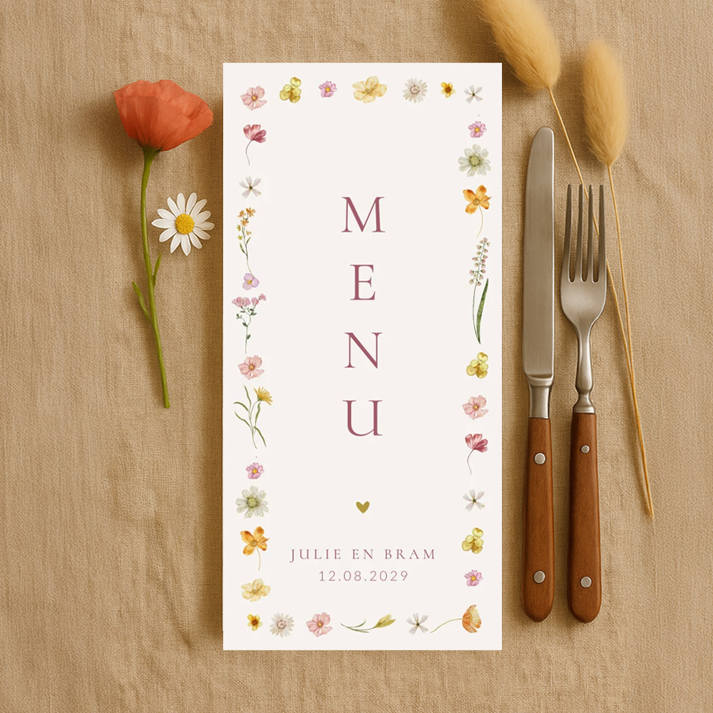 Maak jullie bruiloft compleet met drukwerk in één stijl en voer dezelfde stijl door in de menukaart. Deze langwerpige menukaart heeft een mooi vrolijk bloemenkader en goudfolie hartje. Teksten en kleuren pas je eenvoudig aan in onze editor. Hulp nodig? Laat het ons weten!