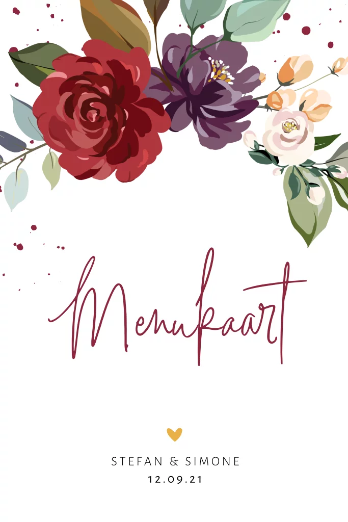 Wil je voor jouw bruiloft een menukaart in stijl van de trouwkaart, romantisch en met bloemen? Dan is deze menu kaart heel erg geschikt. De mooie bloemen in warme tinten en de sierlijke letters geven deze kaart een romantische uitstraling. Behalve voor het huwelijksdiner kun je deze dinerkaart ook voor andere gelegenheden gebruiken.