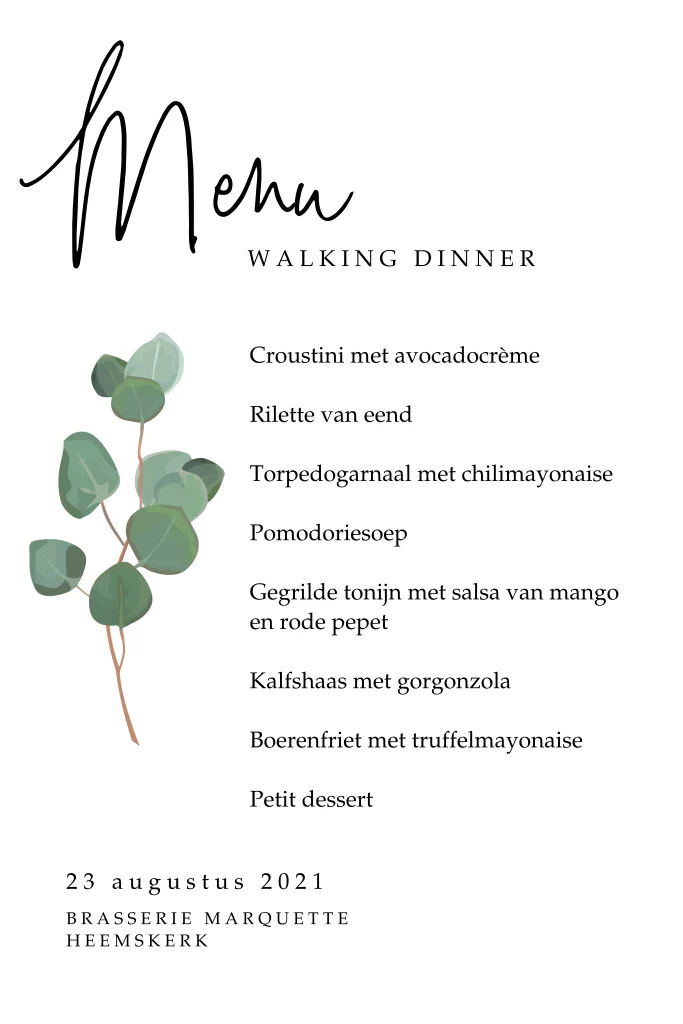 Wil je voor jouw bruiloft een menukaart in een rustige botanische stijl met een klein takje? Dan is deze menukaart heel erg geschikt. Behalve voor het huwelijksdiner kun je deze dinerkaart ook voor andere gelegenheden gebruiken.