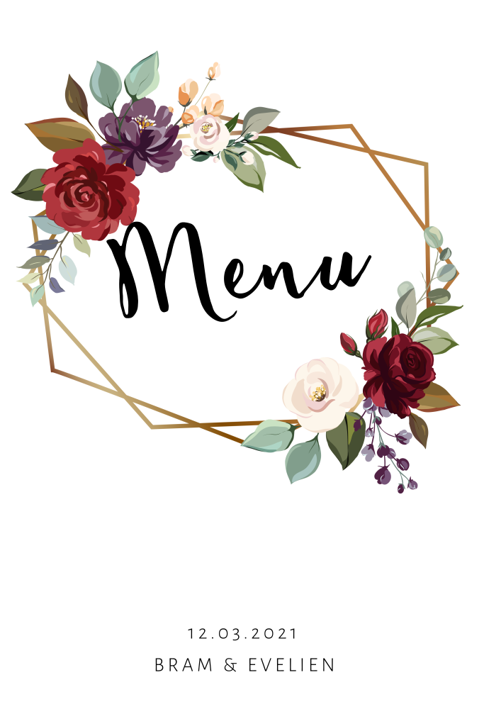 Wil je voor jouw bruiloft een moderne menukaart in stijl van de trouwkaart, romantisch en met bloemen? Dan is deze menu kaart heel erg geschikt. De mooie bloemen in warme tinten en het goudkleurige kader geven deze kaart een romantische uitstraling. Behalve voor het huwelijksdiner kun je deze dinerkaart ook voor andere gelegenheden gebruiken.