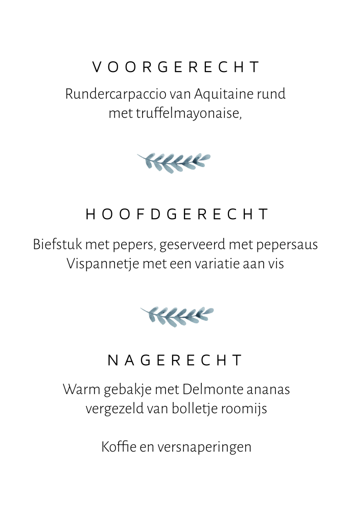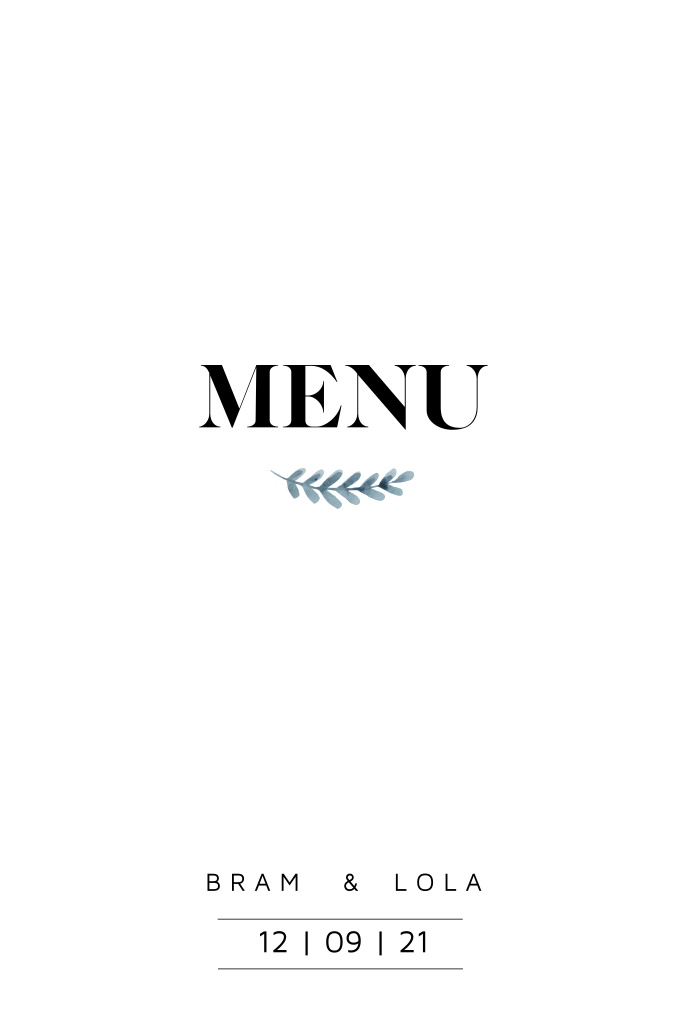 Wil je voor jouw trouwdag een menukaart in een rustige botanisch stijl met een klein takje? Dan is deze menukaart heel erg geschikt. Behalve voor het bruiloftsdiner kun je deze dinerkaart ook voor andere gelegenheden gebruiken.