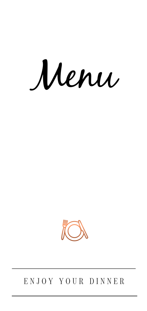 Cleane witte menukaart met een icoontje van een bord met bestek in koperkleur. Deze menukaart is onderdeel van onze trouwhuisstijl Celebration Symbols.