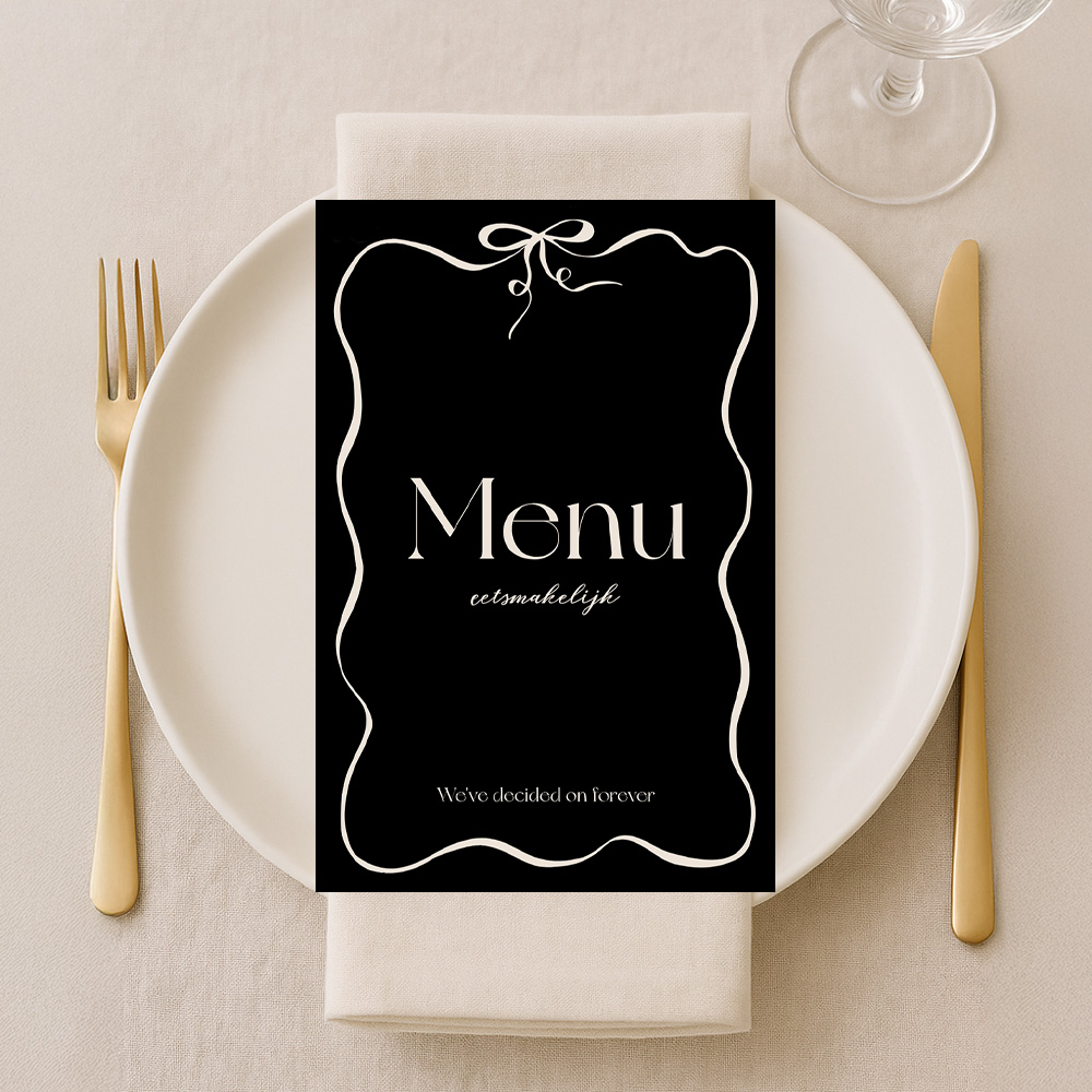 Voer de stijl van je trouwkaart door naar jullie bruiloftsdiner. Deze menukaart heeft een chique uitstraling met een zwart/wit design met een golvende strik. Je kunt deze menukaart zelf bewerken in de editor en naar je eigen wensen aanpassen. Vragen? We helpen je graag!