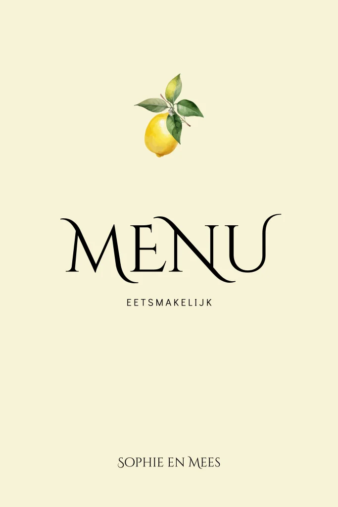Verras je gasten met een smakelijk menu op deze prachtige menukaart. Op de voorzijde van de deze menukaart zie je een lichtgele achtergrond met een illustratie van een citroen met een basic design qua tekst. Teksten en kleuren pas je eenvoudig aan in onze editor. Hulp nodig? Laat het gerust weten!