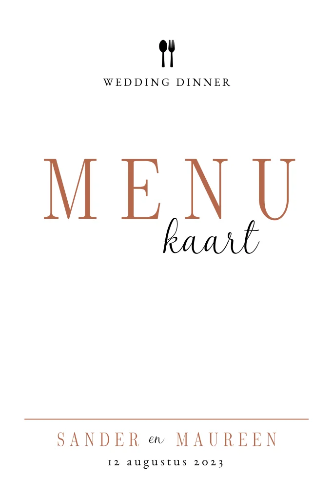 Stijlvolle cleane menukaart in wit met koperkleur. Deze kaart is is onderdeel van onze trouwhuisstijl Clean Koper.