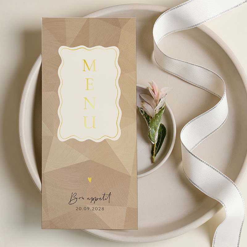 Menukaart voor jullie bruiloft met geometrische vlakken en afgewerkt met luxe goudfolie. Op de voorzijde staat een beige kleurig vak met hierin de letters 'MENU' in goudfolie. De kaart heeft een mooie bruintint als achtergrond. De kleuren en lettertype pas je eenvoudig zelf aan in de online editor. Deze menukaart hoort bij een trouwhuisstijl.