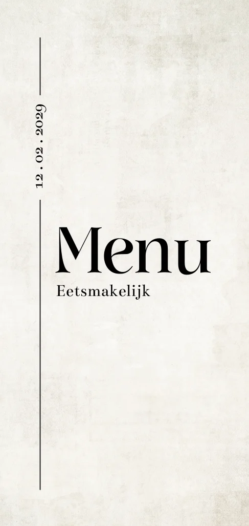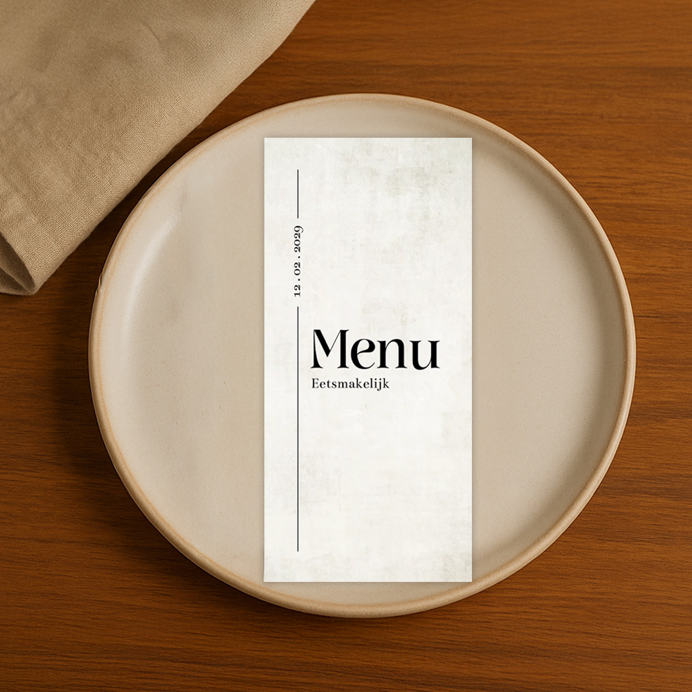 Strakke menukaart voor een huwelijksdiner. Met zijn rustige, minimalistische en klassieke uitstraling past deze menukaart perfect bij elk seizoen. Teksten en kleuren pas je eenvoudig aan in onze editor. Hulp nodig? Laat het ons weten!