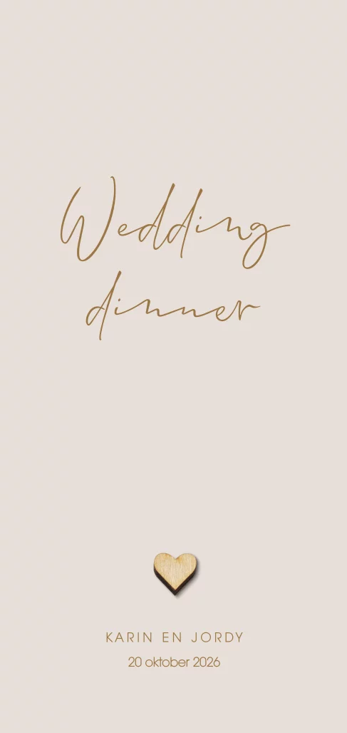 Kies voor jullie smaakvolle "Wedding dinner" deze eenvoudige trendy menukaart met een echt houten hartje en ronde hoeken. Deze menukaart heeft een basic design maar het houten hartje maakt deze kaart helemaal exclusief. Teksten en kleurenpas je eenvoudig aan in onze editor. Hulp nodig? Laat het ons weten!