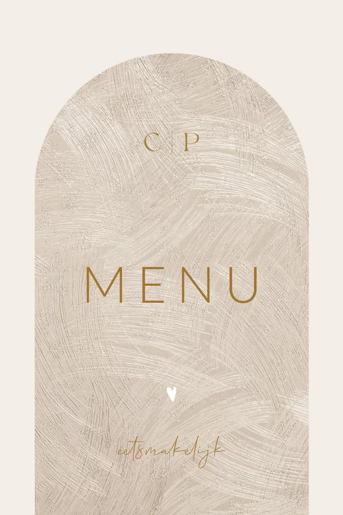 Jullie trouwdag is een unieke dag, een dag waarop alles perfect moet zijn. Daarbij hoort natuurlijk ook een heerlijk menu. Verras je gasten met deze prachtige menukaart. Op deze menukaart staat een organische boogvorm met een beige goudkleurige achtergrond structuur. Pas deze unieke menukaart naar je eigen smaak aan in onze ontwerpmodule. Hulp nodig? Laat het gerust weten!
