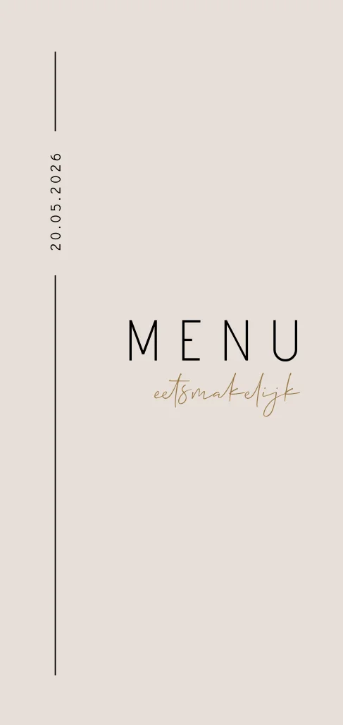 Strakke menukaart voor een huwelijksdiner. Met zijn rustige, minimalistische en klassieke uitstraling past deze menukaart perfect bij elk seizoen. Teksten en kleuren pas je eenvoudig aan in onze editor. Hulp nodig? Laat het ons weten!