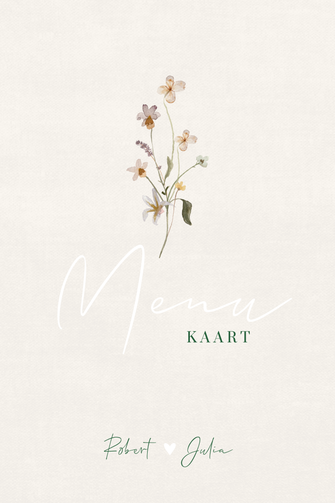 Stijlvolle menukaart voor jullie bruiloft met ronde hoeken en aquarel bloemetjes. Deze rustige beige menukaart heeft een linnenlook achtergrond en mooie naturel kleuren en goudfolie. De kleur van de foliebedrukking en de teksten kun je in de ontwerpmodule aanpassen. Vragen? Laat het ons weten!