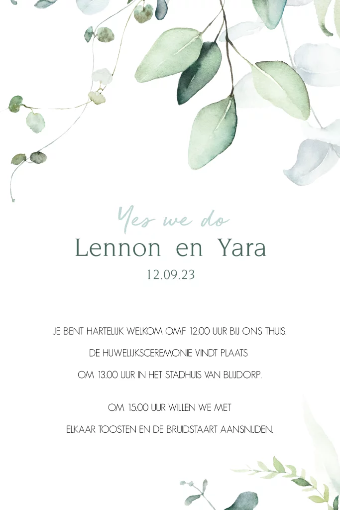 Pocketfold trouwkaart met diverse mooie watercolor blaadjes en takjes. Deze kaart is onderdeel van onze pocketfold serie en tevens trouwhuisstijl Floral and Blue. Plak deze kaart in een trendy pocketfold en combineer met bijpassende extra kaartjes om zo je eigen trouwkaarten set compleet te maken.