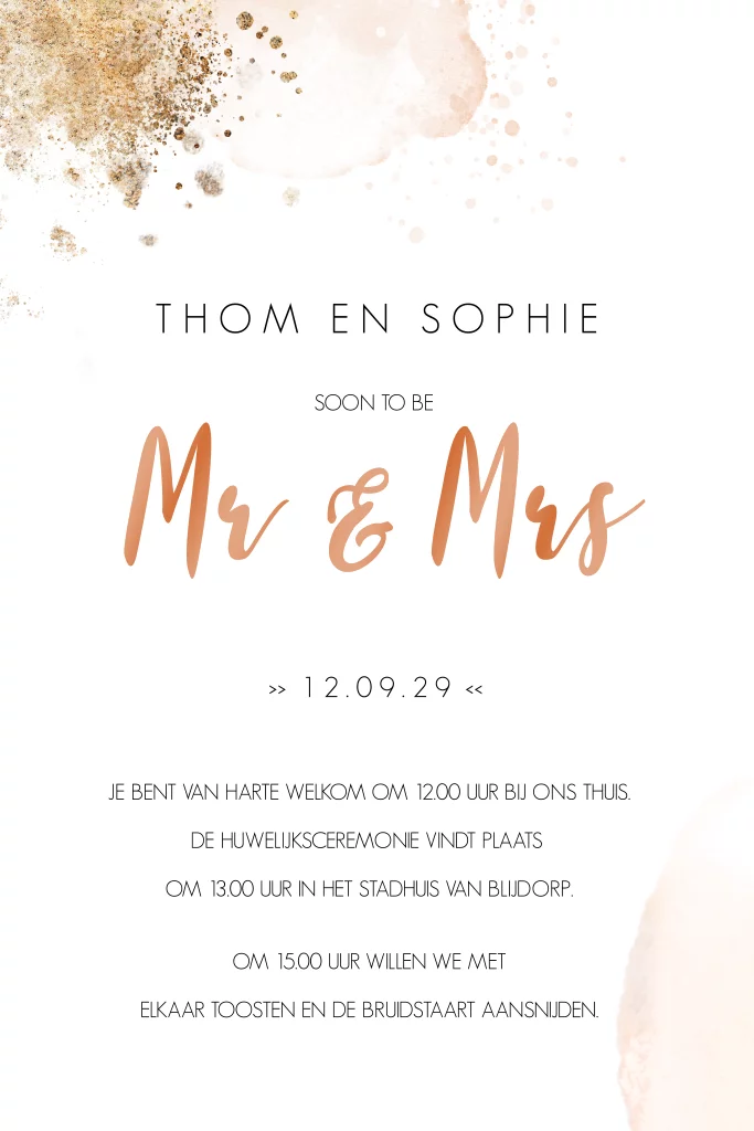 Luxe pocketfold trouwkaart " Stijlvol Koper" met hoogglans, aquarel en goudkleurige spetters. De tekst "Mr & Mrs" wordt gedrukt in hoogglans. Dat geeft je kaart een extra luxe uitstraling. Deze trouwkaart plak je in het pocketfold mapje en bevat daarom geen bedrukking op de achterzijde. Maak je pocketfold compleet door te combineren met extra kaartjes uit de "Stijlvol Koper" serie van onze pocketfold trouwcollectie.