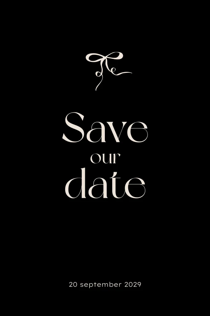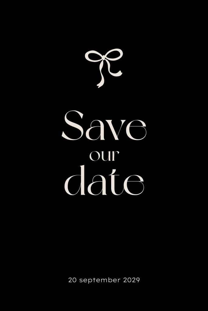 Stijlvolle save the date kaart om jullie grote dag aan te kondigen. De achtergrond is klassiek zwart met een strikje op de voorzijde. Pas de kleuren makkelijk zelf aan in de online editor.