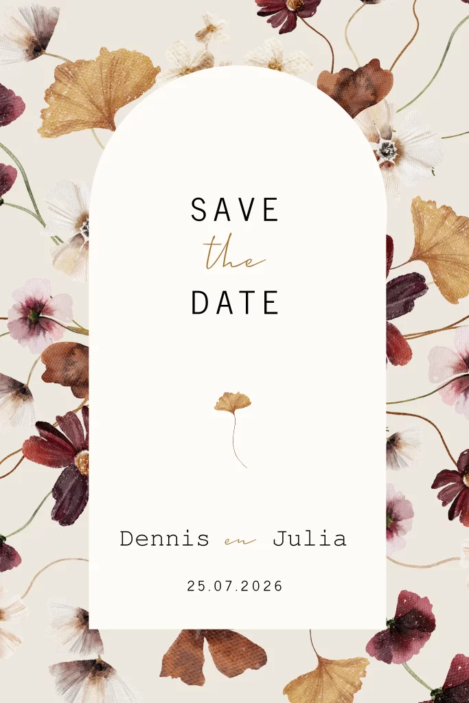 Save the Date: een stijlvolle kaart zodat iedereen alvast op de hoogte is van jullie trouwdatum. Op deze romantische Save the Date kaart een kader met tekst in boogvorm, omringd door aquarel bloemen in trendy kleuren. In onze editor maak je het kaartje helemaal persoonlijk. Hulp nodig? We helpen je graag!