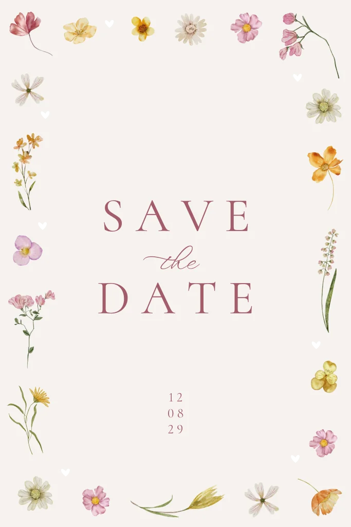 Een romantische Save the Date kaart met een bloemen kader van vrolijke veldbloemen. Deze Save the Date kaart straalt luxe uit door het goudfolie. Pas alles naar eigen wens aan in de editor.