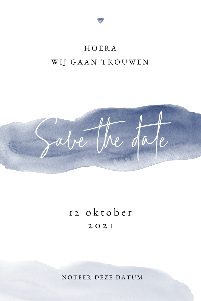Kondig jullie huwelijk aan met deze moderne rustige save the date met aquarel. Er is gebruik gemaakt van sierlijke letters. Een subtiel aquarel hartje maakt de kaart compleet!